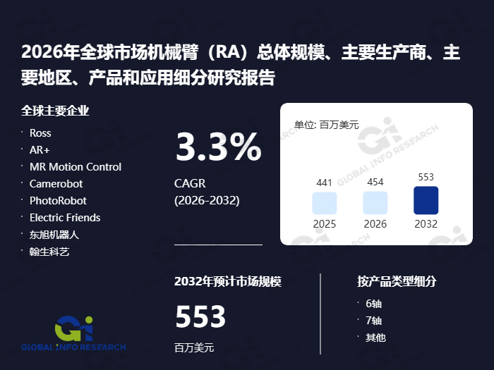 按照环洋市场征询的调研数据,按收入计,2025年全球机械臂市场总收入约为4。41亿美元,估计到2032年将达到5。53亿美元,正在2026年至2032年的预测期内,年复合增加率估计为3。3%。